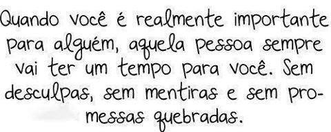 "Quando você é realmente importante para alguém, aquela pessoa sempre vai ter tempo para si. Sem desculpas, sem mentiras e sem promessas quebradas."